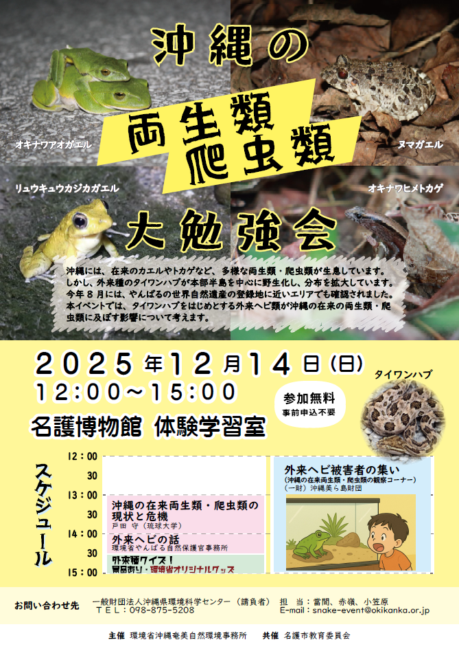 環境省やんばる自然保護官事務所では、来る12月14日(日)に、名護博物館にて、イベント「沖縄の両生類・爬虫類 大勉強会」を開催します!