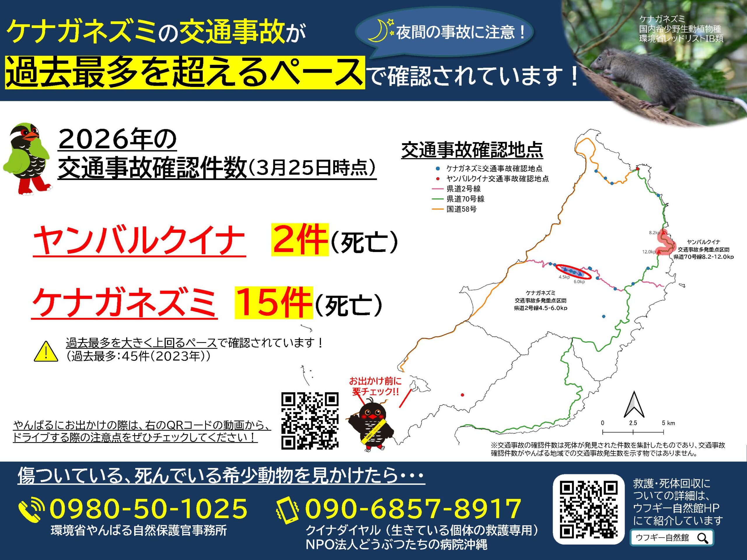 やんばる地域で確認された野生動物との交通事故(ロードキル)情報です。